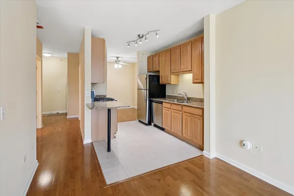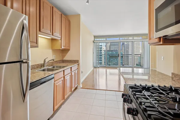 You're going to love this bright, east-facing Junior 1-Bedroom condo at Park Alexandria! Situated on a high floor, this home boasts stunning city views that will greet you every morning. The original studio layout has been modified with a partial wall to create a more private, separate bedroom. Step inside and you'll find hardwood floors flowing throughout. The island kitchen is a chef's delight, featuring stainless steel appliances, 42-inch maple cabinets, and a granite island/breakfast bar that seamlessly opens into the spacious living room area, perfect for entertaining. The home's highlight is the large private balcony that offers an amazing spot to take in the beautiful cityscape. With great closet space, you'll have plenty of storage. This is the perfect in-town residence or first home. Park Alexandria is a full-amenity building offering residents an incredible lifestyle, including a 24-hour door person, 9,000 sq. ft. outdoor terrace with a convenient dog run, exercise room, party/meeting room, and 2 fully furnished guest suites. Includes garage parking space (P-269) and an exterior storage cage (#45).